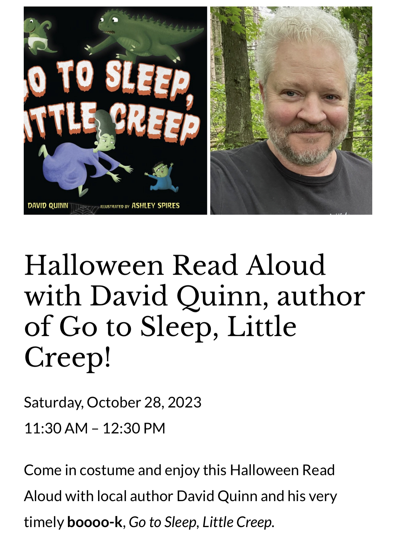 Join us – in costume, if you like – for a Halloween Read Aloud with Ossining author David Quinn and his adorably ghoulish Go To Sleep, Little Creep.