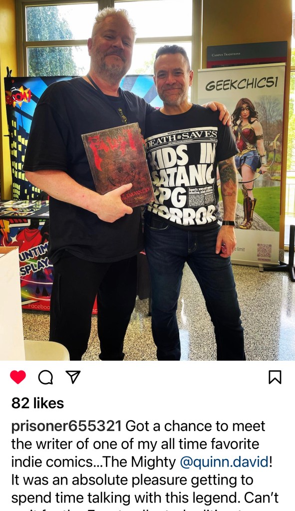 ONE: Once every backer has received his or her book, Tim Vigil and David Quinn will sell the remaining Kickstarter overprint (produced providently because we knew that copies would be lost or damaged during delivery) at the usual places we offer signed books, on Tim’s Patreon (subscription, but worth it) and on David’s Blog’s Signed Book Page (follow for free), as well as at public appearances. (And if you don’t see us on the guest list at your local convention, speak to that convention!) You read this here first… please don’t tell us we didn’t warn you!